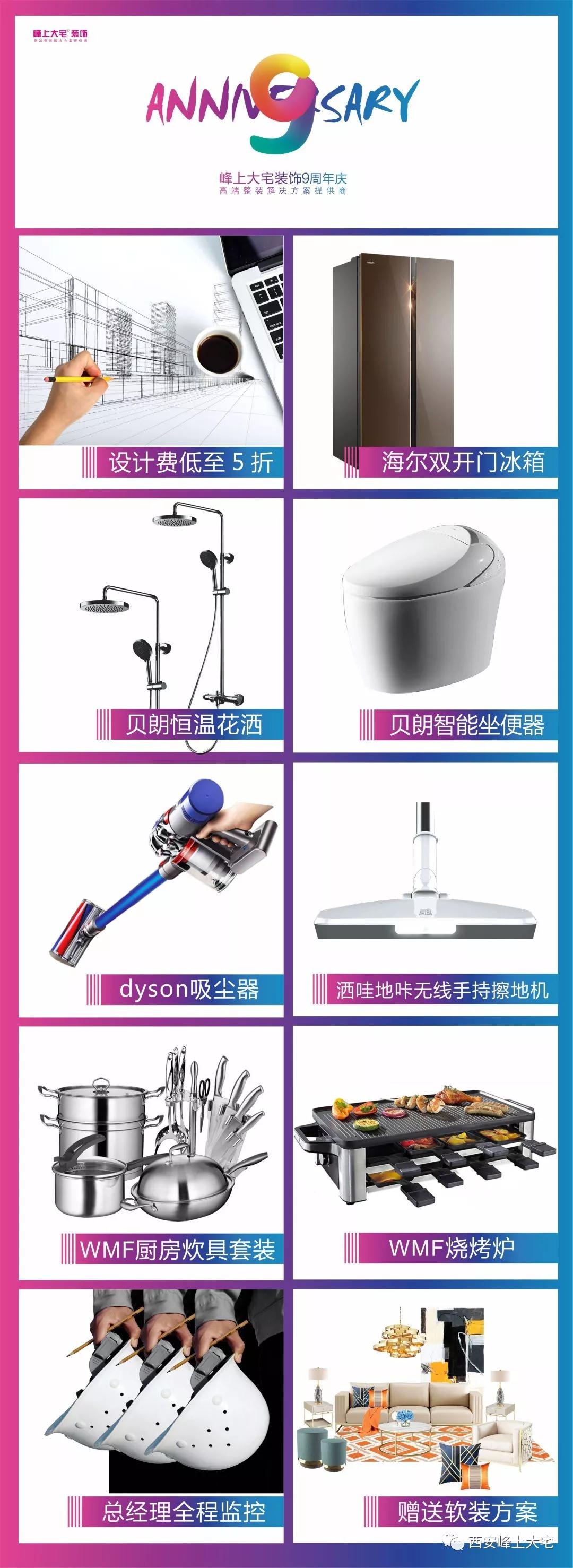 重点来喽,6月9日,“峰上大宅九周年庆”的第一站选在曲江W酒店!设计费5折优惠、海尔双开门冰箱、贝朗恒温花洒、智能坐便器、戴森吸尘器、洒哇地咔无线手持擦地机、还有WMF高端厨具等更多超值家装礼包等你带回家!